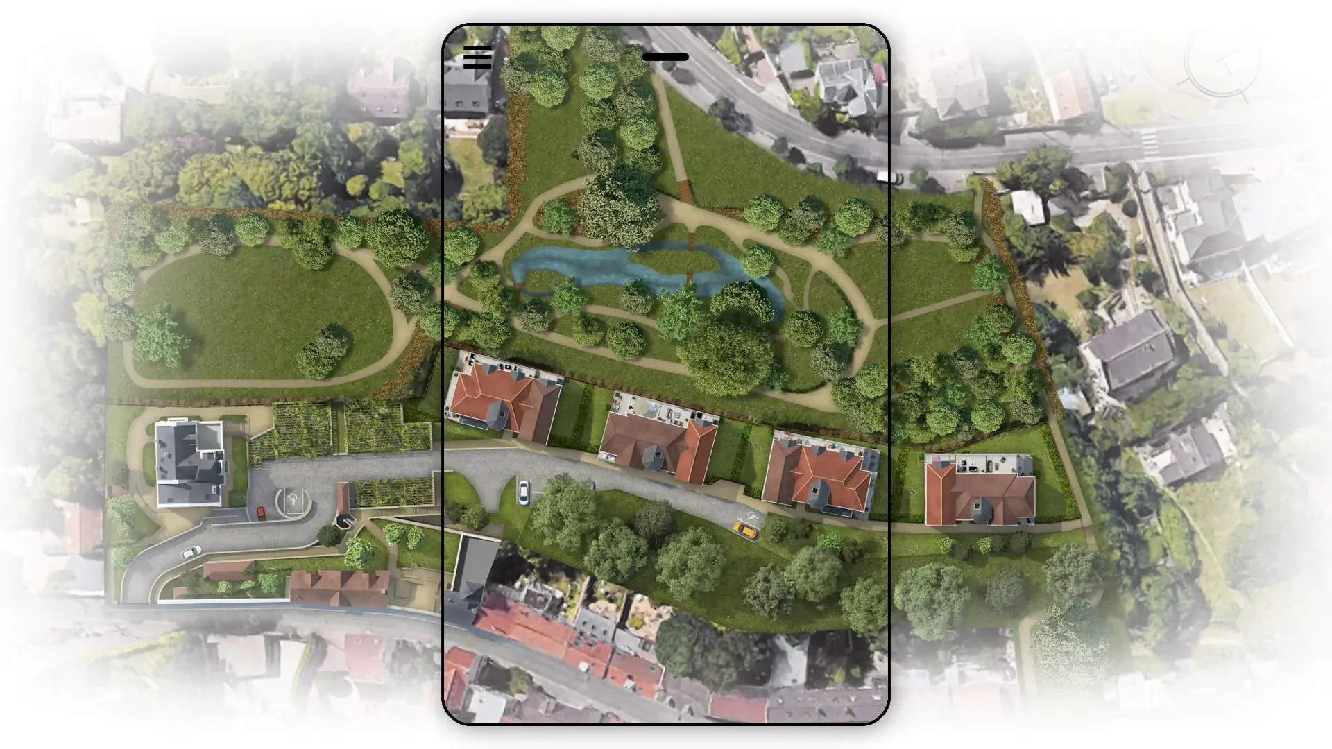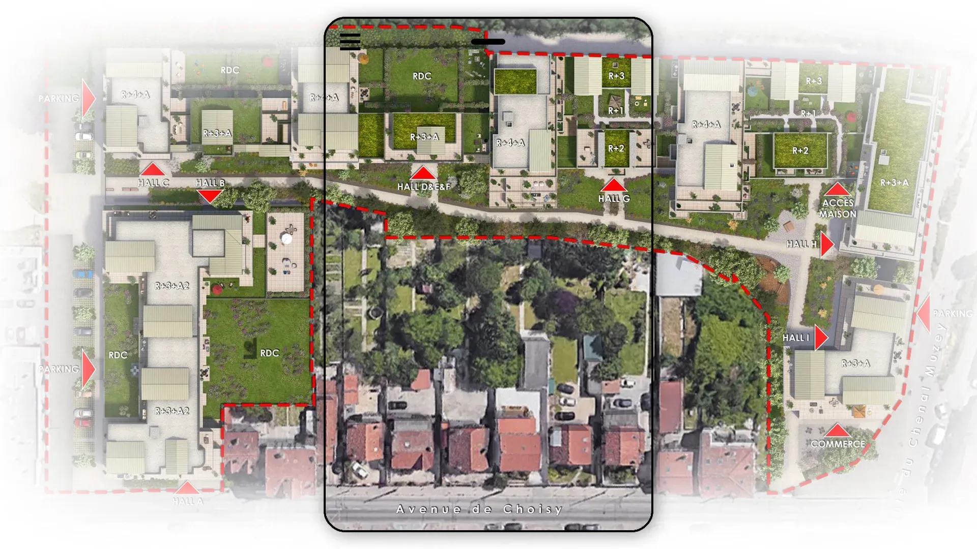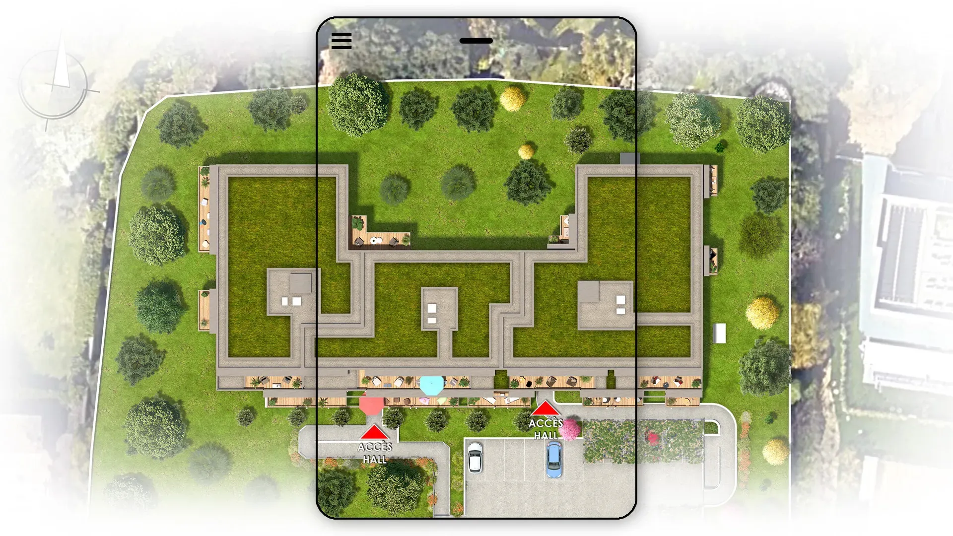 The site plan is an essential document for representing a project's layout on its land: orientation, access, traffic routes, parking, landscaping, green spaces, and building volumes. Thanks to its orthographic view, AXEON-360 creates a clear, structured, and realistic representation of the entire project, allowing its organization to be grasped at a glance. This type of visualization is a major asset during the pre-sales, technical discussions, and administrative approval phases.